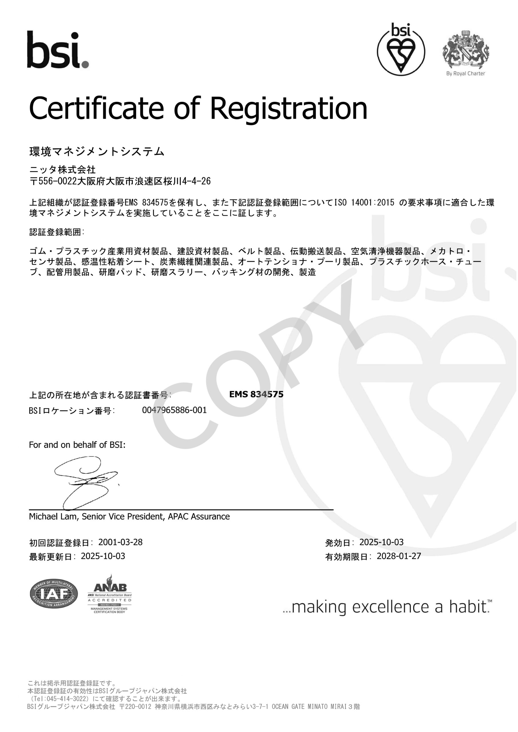 ニッタグループ(以下「当社グループ」とします)は、働く人々の安全と健康を最優先し、地球環境保護と質の高い製品・サービスを提供するため、労働安全衛生・環境・品質マネジメントシステムを運用し、関連法規制およびその他の要求事項を遵守するとともに、継続的な改善を行います。