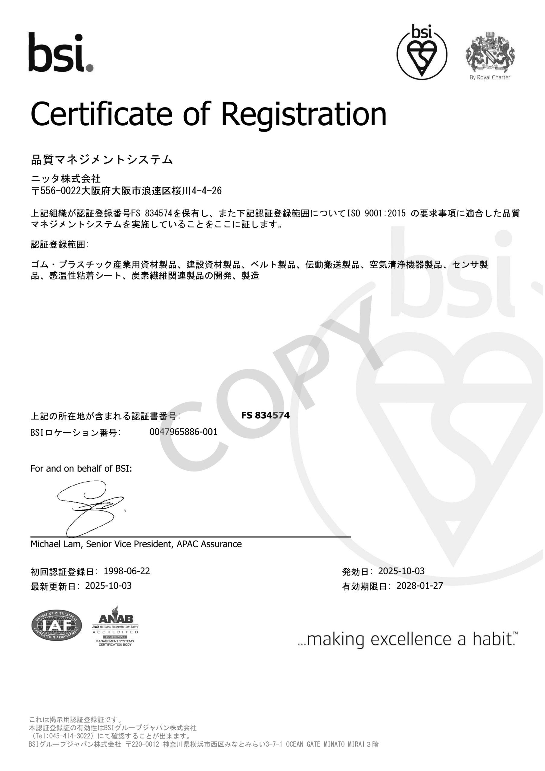 品質の継続的改善を図るため、2015年1月にISO9001(品質マネジメントシステム)を認証取得。